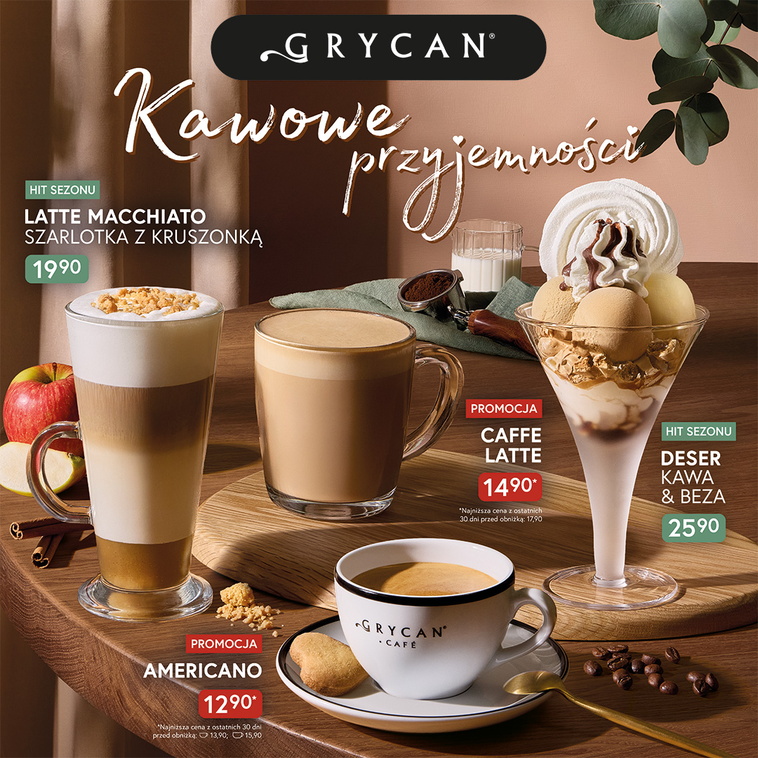 Do 2 grudnia w lodziarnio-kawiarniach GRYCAN dostępna jest sezonowa oferta KAWOWE PRZYJEMNOŚCI, stworzona z myślą o miłośnikach aromatycznej kawy i deserów lodowych. W menu znalazły się wyjątkowe propozycje: hity jesiennego sezonu, takie jak Latte Macchiato Szarlotka z kruszonką z sosem szarlotkowym własnej produkcji i chrupiącą maślaną kruszonką oraz wyborny Deser Kawa & Beza. Uzupełnieniem oferty są klasyczne kawy oferowane w promocyjnych cenach – Americano i Caffe latte.